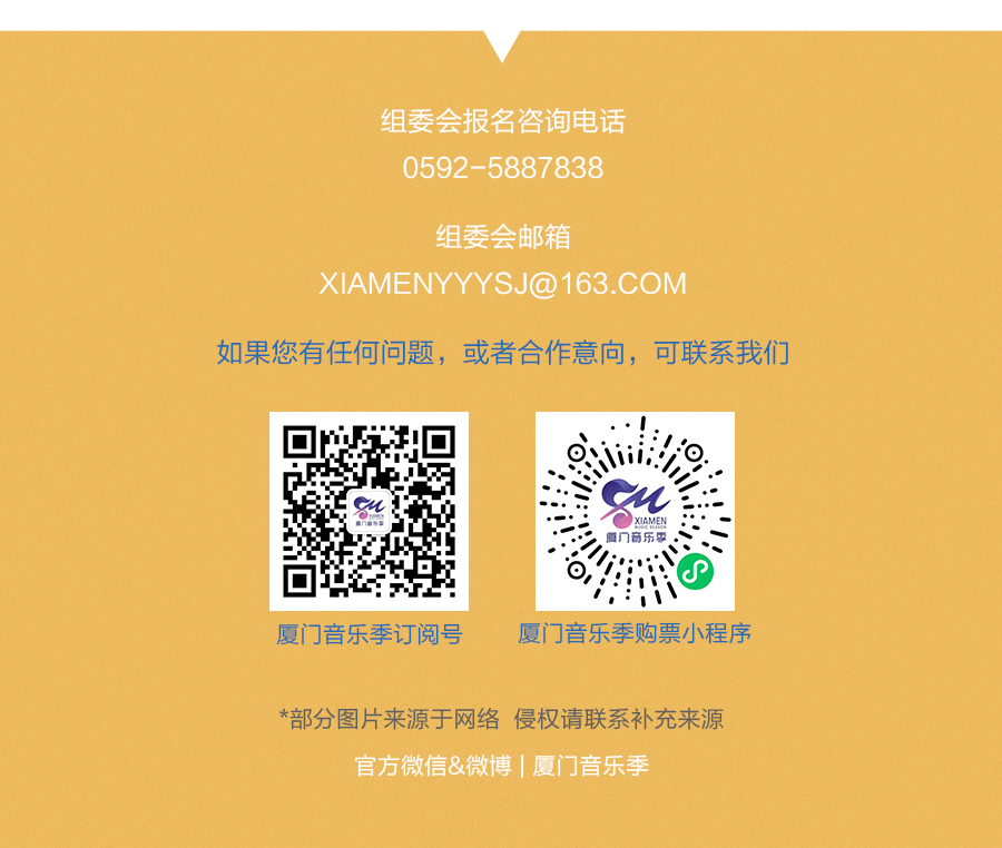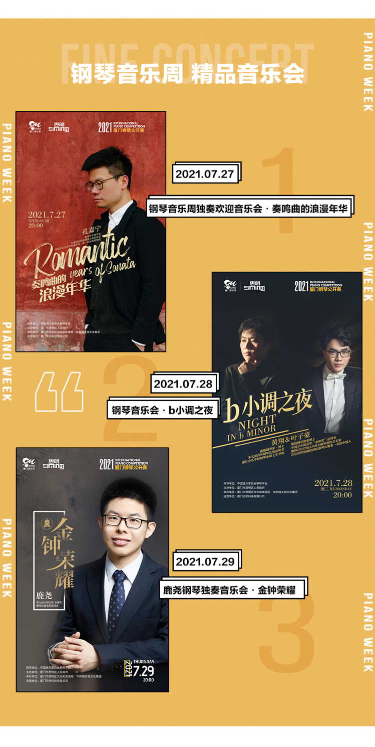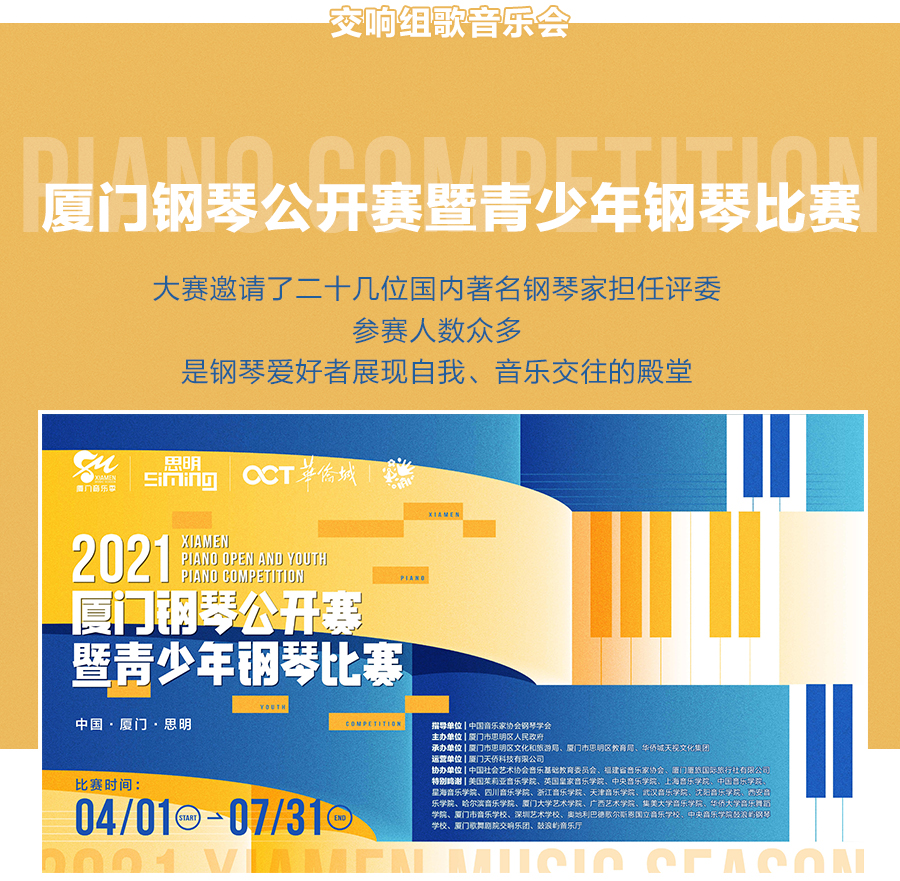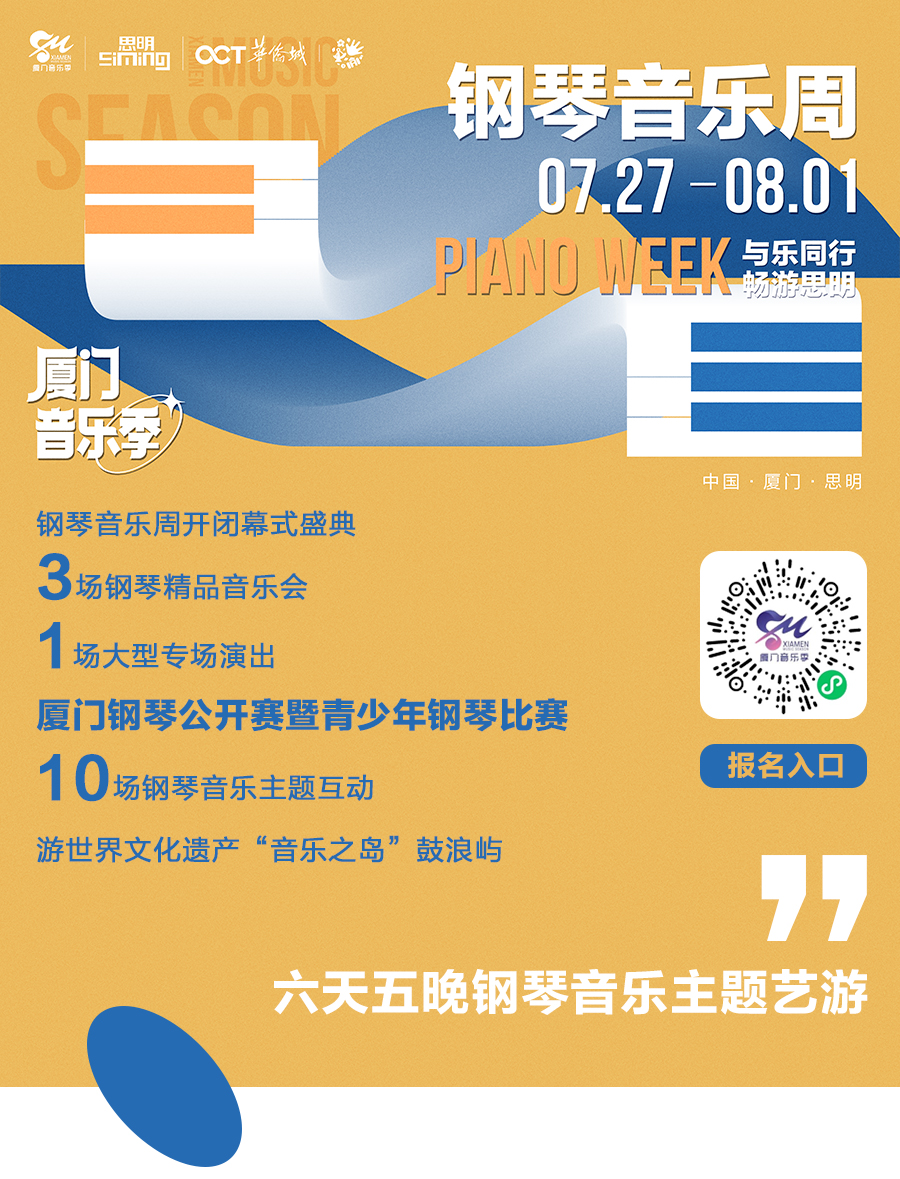 2021厦门音乐季-六天五晚钢琴音乐主题艺游 分类: 新闻资讯, 资讯作者:厦门音乐季2021年7月15日文章导航上一篇上一篇文章:2021厦门音乐季-六天五晚吉他音乐主题艺游下一篇下一篇文章:2021厦门音乐季-六天五晚弦乐音乐主题艺游相关内容延期公告 | 2021厦门音乐季整体延期2021年8月2日喜报!2021厦门音乐季钢琴公开赛非专业组选手获奖名单公示2021年8月1日45、喜报!2021厦门音乐季钢琴公开赛专业组选手获奖名单公示2021年7月31日回顾 | 2021厦门音乐季钢琴音乐周全程回顾2021年7月31日钢琴音乐周第四日回顾 | 鼓浪屿上演终极对决,点评会大师班干货满满2021年7月31日钢琴音乐周第三日回顾 | 让琴键在指尖飞舞,让音乐在鹭岛飞扬2021年7月30日