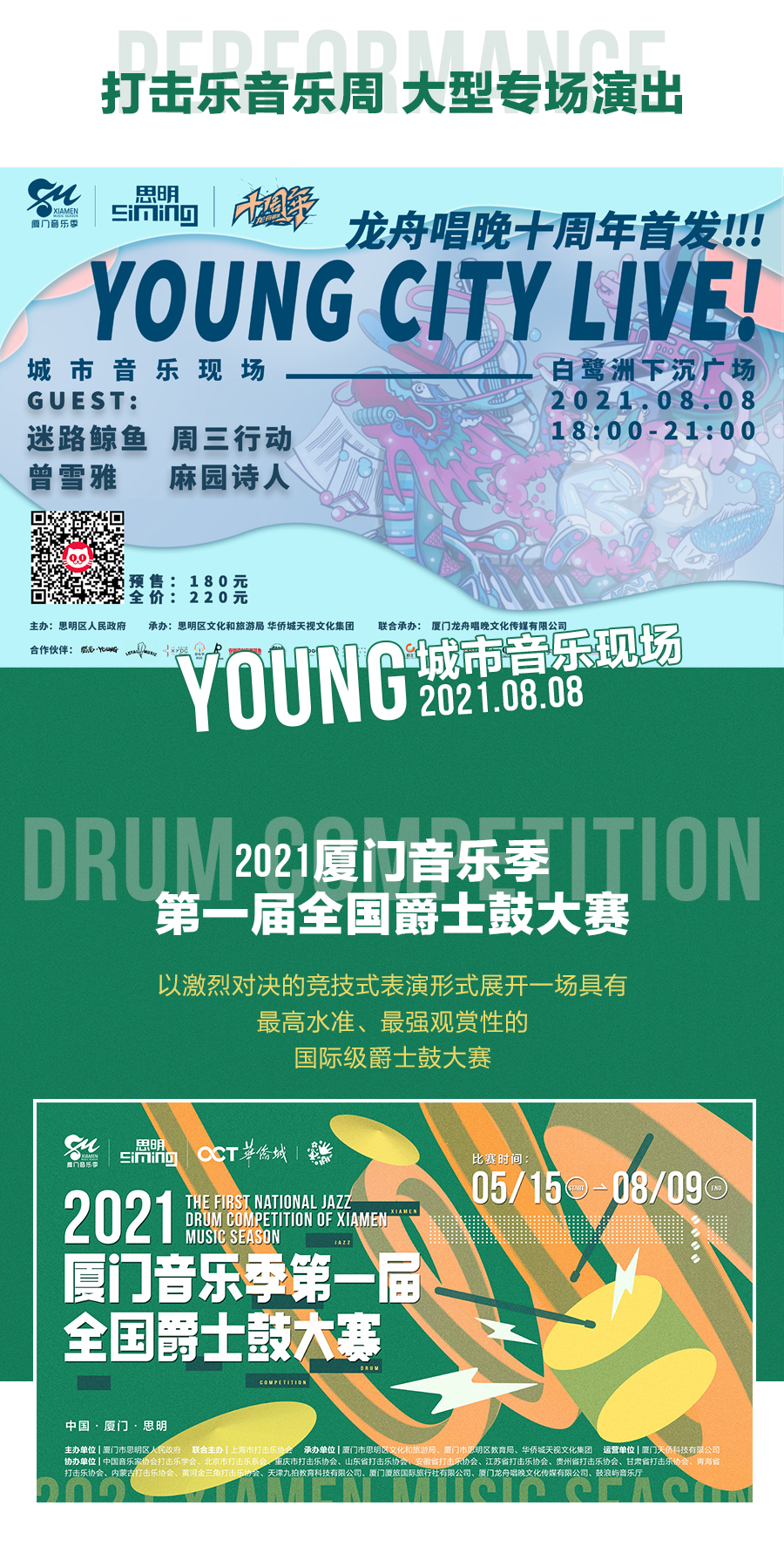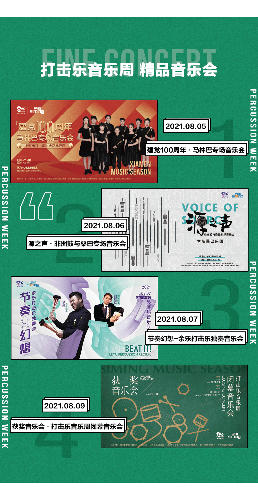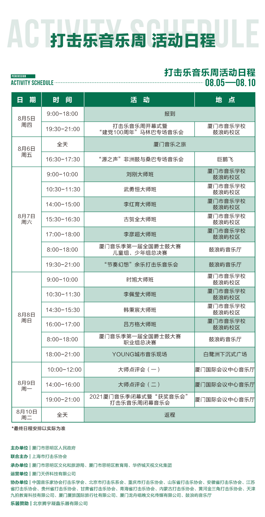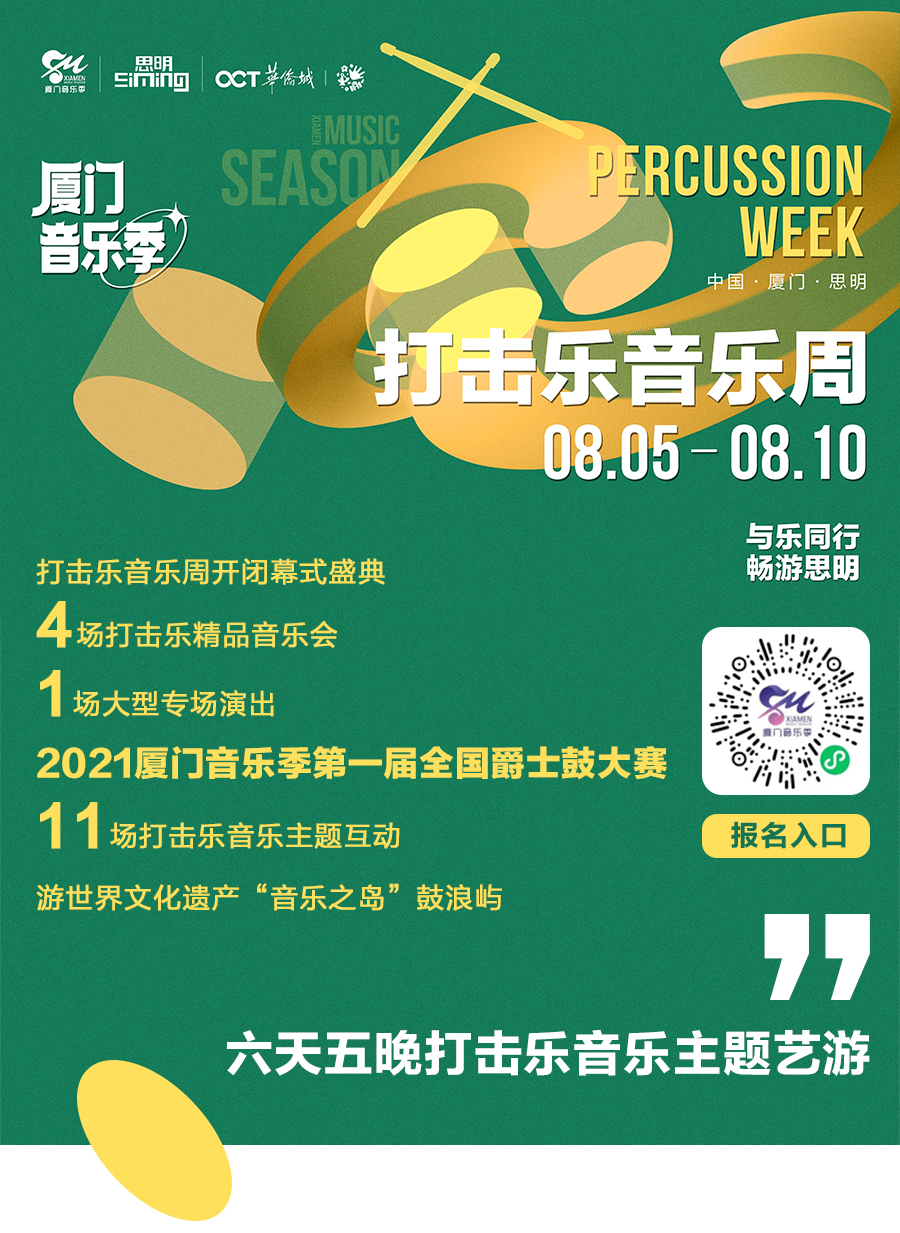 2021厦门音乐季-六天五晚打击乐音乐主题艺游 分类: 新闻资讯, 资讯作者:厦门音乐季2021年7月15日标签: 2019厦门音乐季弦乐音乐周报名文章导航上一篇上一篇文章:报!厦门音乐季音乐列车上线啦!下一篇下一篇文章:2021厦门音乐季-六天五晚吉他音乐主题艺游相关内容延期公告 | 2021厦门音乐季整体延期2021年8月2日喜报!2021厦门音乐季钢琴公开赛非专业组选手获奖名单公示2021年8月1日45、喜报!2021厦门音乐季钢琴公开赛专业组选手获奖名单公示2021年7月31日回顾 | 2021厦门音乐季钢琴音乐周全程回顾2021年7月31日钢琴音乐周第四日回顾 | 鼓浪屿上演终极对决,点评会大师班干货满满2021年7月31日钢琴音乐周第三日回顾 | 让琴键在指尖飞舞,让音乐在鹭岛飞扬2021年7月30日