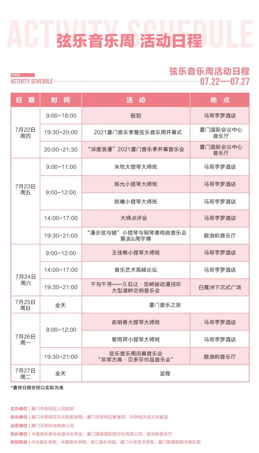 2021厦门音乐季-六天五晚弦乐音乐主题艺游 分类: 新闻资讯, 资讯作者:厦门音乐季2021年7月15日标签: 2019厦门音乐季文章导航上一篇上一篇文章:2021厦门音乐季-六天五晚钢琴音乐主题艺游下一篇下一篇文章:2021厦门音乐季新闻发布会今日召开 —— 三赛四周齐亮相,文旅融合新升级!相关内容延期公告 | 2021厦门音乐季整体延期2021年8月2日喜报!2021厦门音乐季钢琴公开赛非专业组选手获奖名单公示2021年8月1日45、喜报!2021厦门音乐季钢琴公开赛专业组选手获奖名单公示2021年7月31日回顾 | 2021厦门音乐季钢琴音乐周全程回顾2021年7月31日钢琴音乐周第四日回顾 | 鼓浪屿上演终极对决,点评会大师班干货满满2021年7月31日钢琴音乐周第三日回顾 | 让琴键在指尖飞舞,让音乐在鹭岛飞扬2021年7月30日