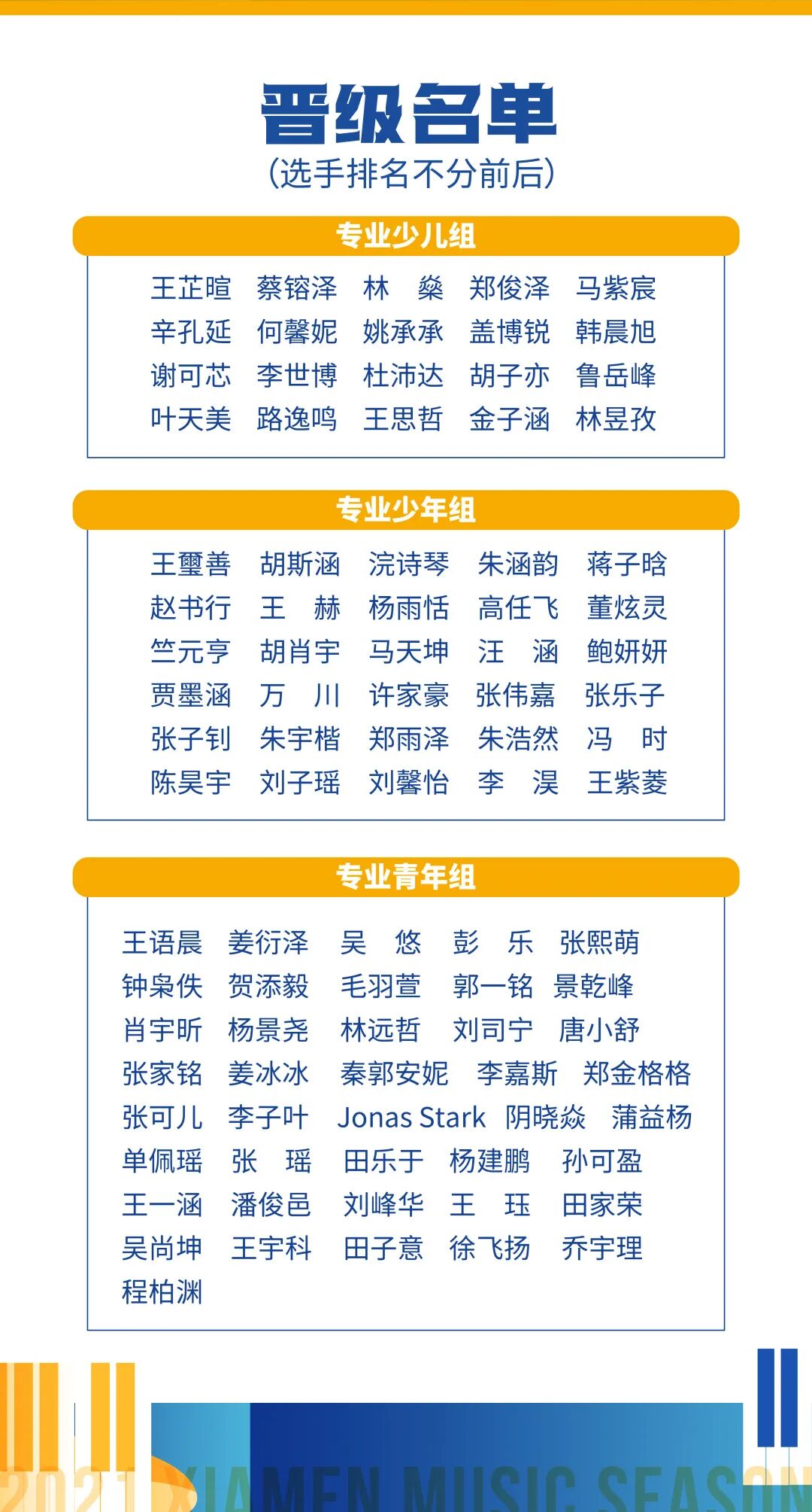 备注:该组按本轮成绩排名,前三名的选手进入协奏曲决赛,最终成绩计算方法:复赛成绩占30%,协奏曲成绩占70%;本轮成绩在四、五、六名的选手无缘决赛环节,但同样享有该组最终名次荣誉及对应的奖金