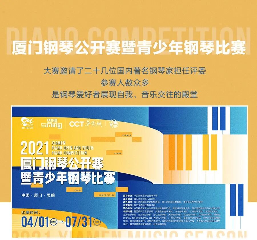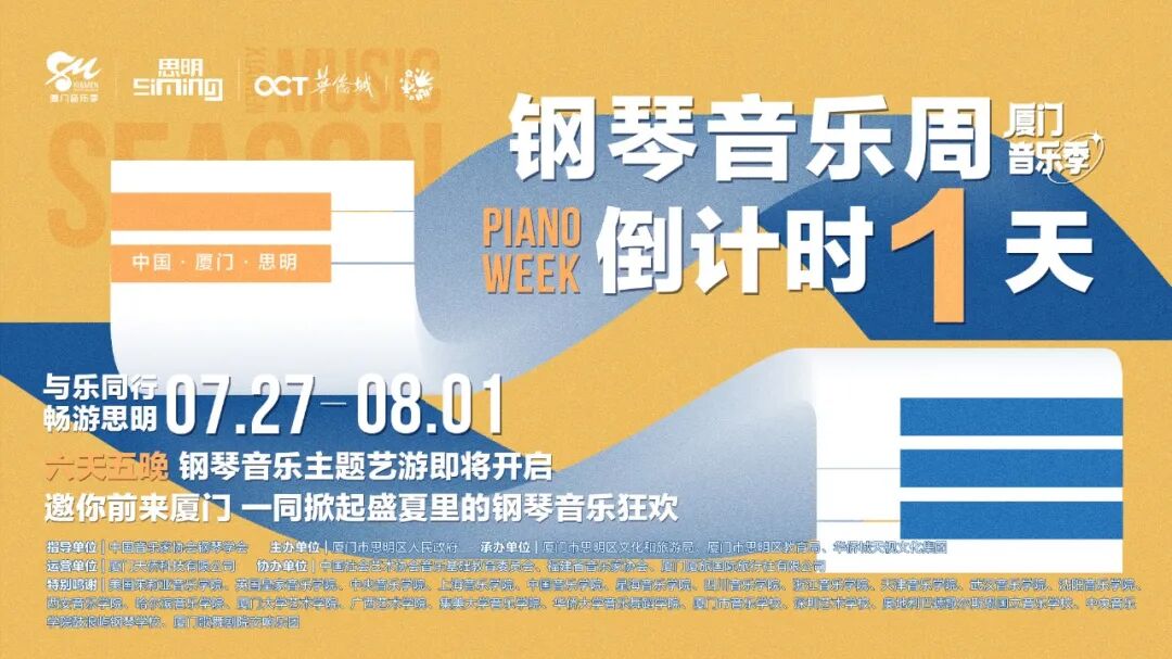 倒计时1天|六天五晚钢琴音乐主题艺游即将开始 2021年的盛夏 与乐同行 畅游思明 2021厦门音乐季 · 钢琴音乐周 倒计时1天 2021厦门音乐季 钢琴音乐周 超多精彩活动等你来! 分类: 新闻资讯, 资讯, 音乐游学作者:厦门音乐季2021年7月26日文章导航上一篇上一篇文章:2021厦门音乐季-弦乐音乐周今日圆满落幕!下一篇下一篇文章:2021厦门音乐季关于疫情防控的通知!相关内容延期公告 | 2021厦门音乐季整体延期2021年8月2日喜报!2021厦门音乐季钢琴公开赛非专业组选手获奖名单公示2021年8月1日45、喜报!2021厦门音乐季钢琴公开赛专业组选手获奖名单公示2021年7月31日回顾 | 2021厦门音乐季钢琴音乐周全程回顾2021年7月31日钢琴音乐周第四日回顾 | 鼓浪屿上演终极对决,点评会大师班干货满满2021年7月31日钢琴音乐周第三日回顾 | 让琴键在指尖飞舞,让音乐在鹭岛飞扬2021年7月30日